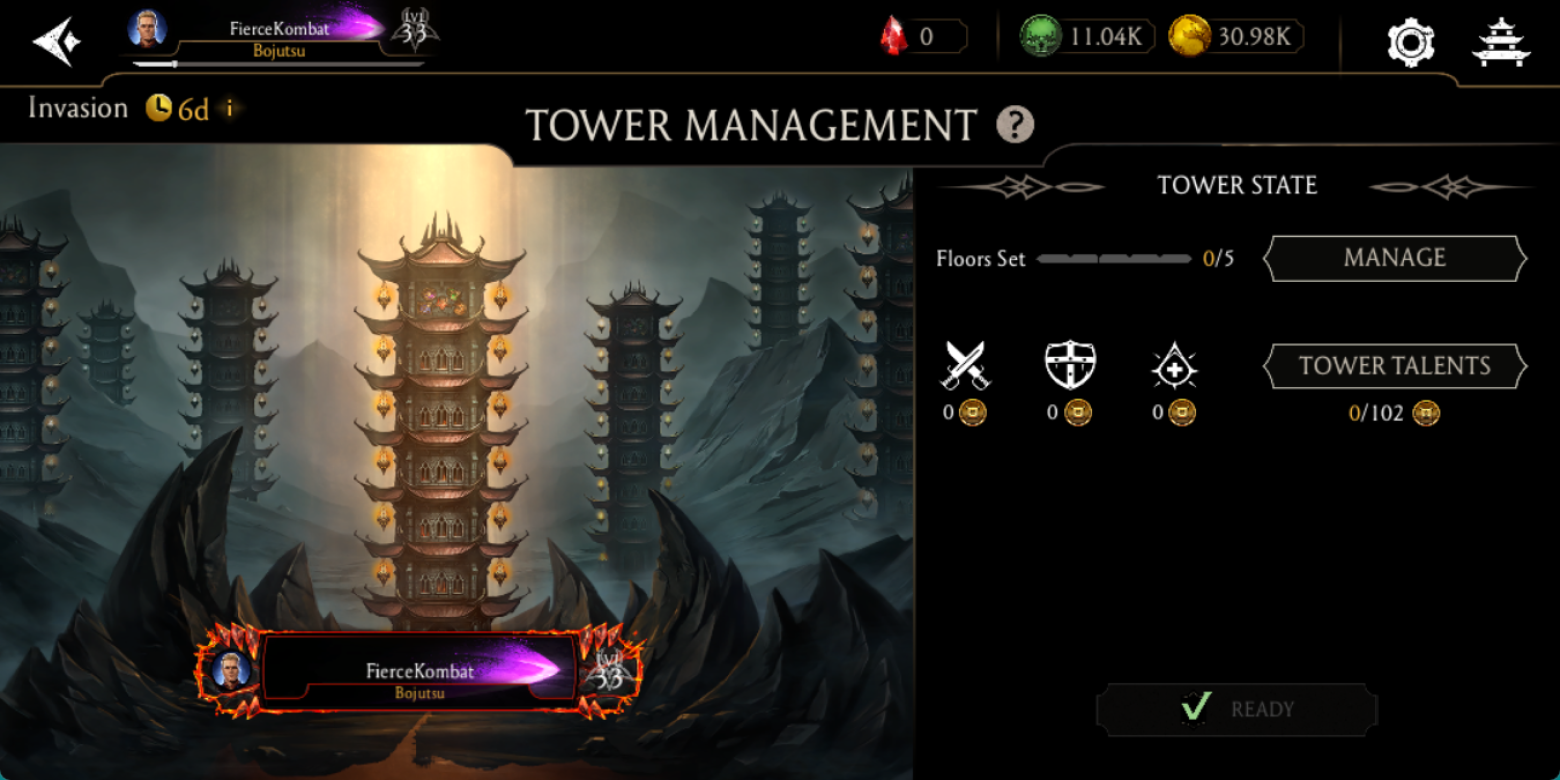 Entering the middle yellow portal from the Realm Klash menu reveals the Tower Management menu. From here, you can see which phase is active and engage in that phase’s activities. This mode is divided into two phases, the Preparation and Invasion Phases. Depending on the active phase, only certain options are available.